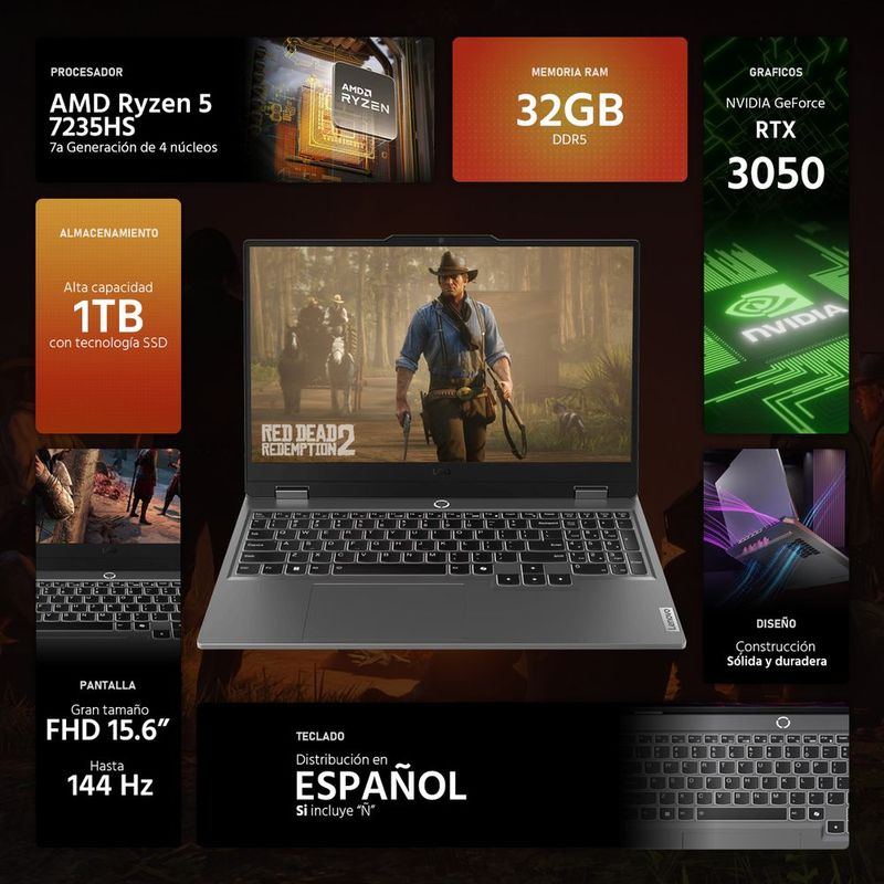 CómputoPortátilesGamingLaptop gamer lenovo loq rtx 3050 ryzen 5 32gb 1tb