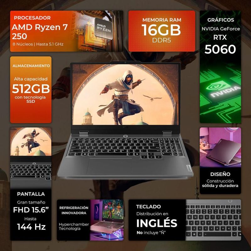 CómputoPortátilesGamingLaptop gamer lenovo loq rtx 5060 ryzen 7 16gb ddr5 512gb