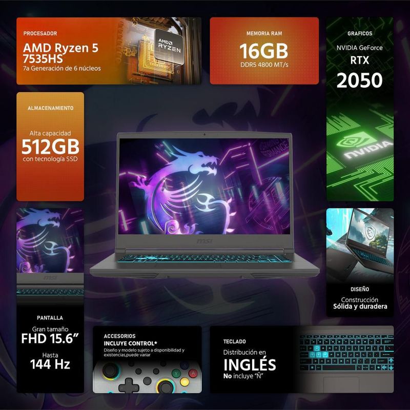 CómputoPortátilesGamingLaptop gamer msi thin rtx 2050 ryzen 5 16g 512gb ssd control