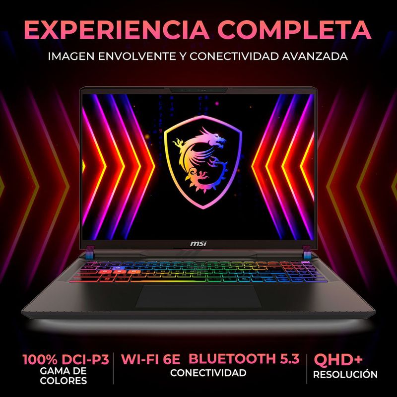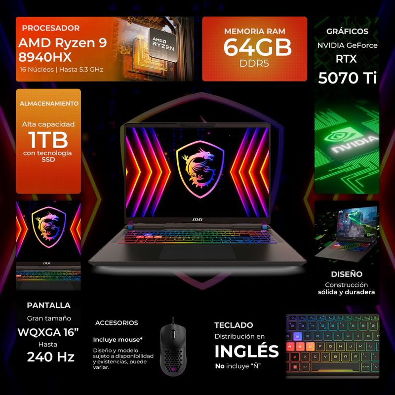CómputoPortátilesGamingLaptop gamer msi vector rtx 5070 ti ryzen 9 8940hx 64gb 1tb