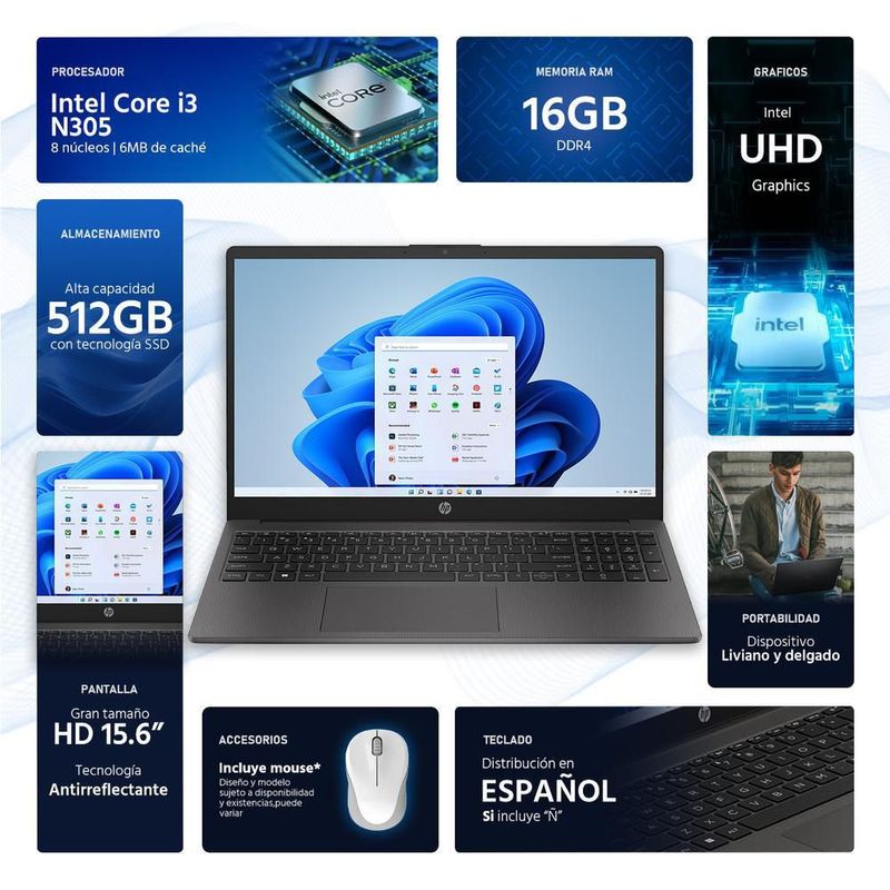CómputoPortátilesLaptopsLaptop hp 250 g10 core i3 n305 16gb ssd 512gb 15.6 + mouse