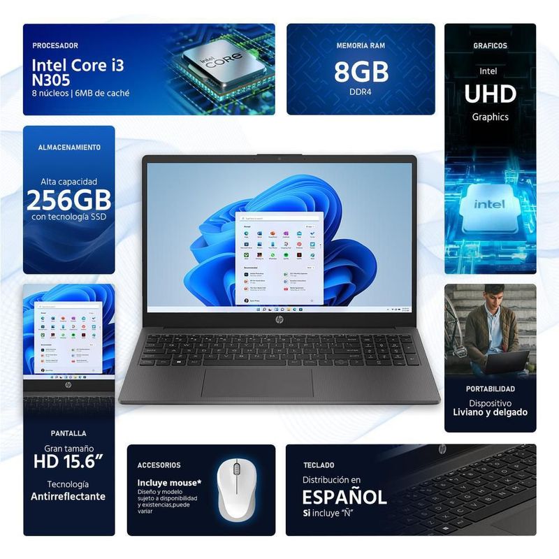 CómputoPortátilesLaptopsLaptop hp 250 g10 intel core i3 n305 8gb 256gb ssd mouse dxt
