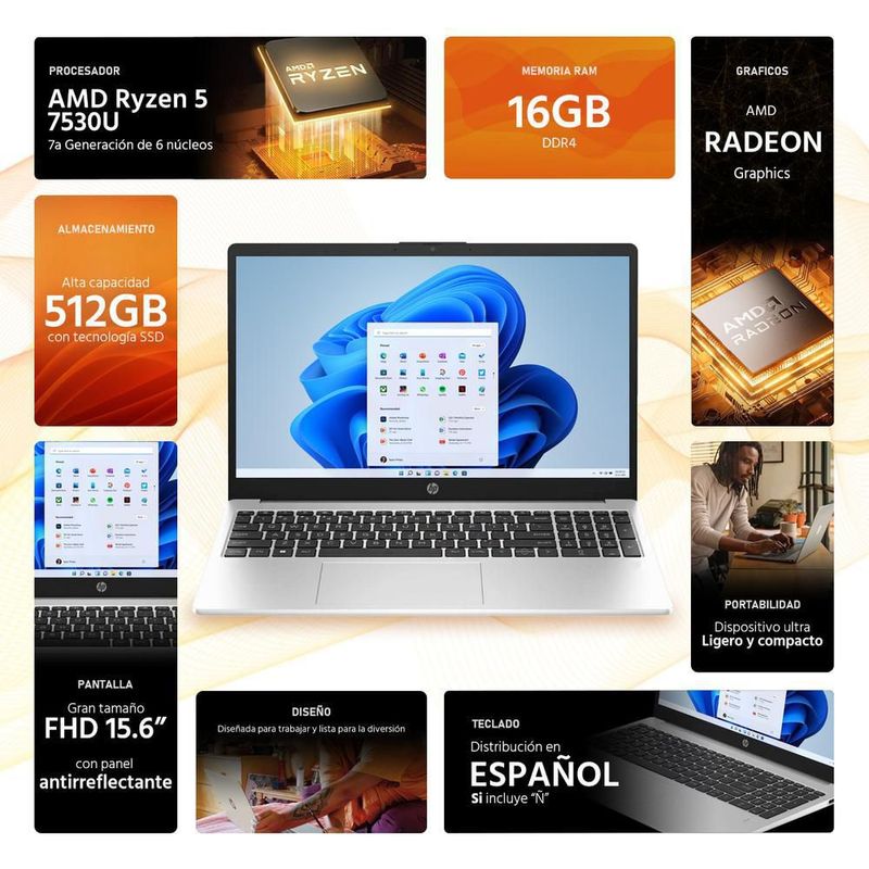 CómputoPortátilesLaptopsLaptop hp 255 g10 ryzen 5 7530u 16gb ssd 512gb 15.6
