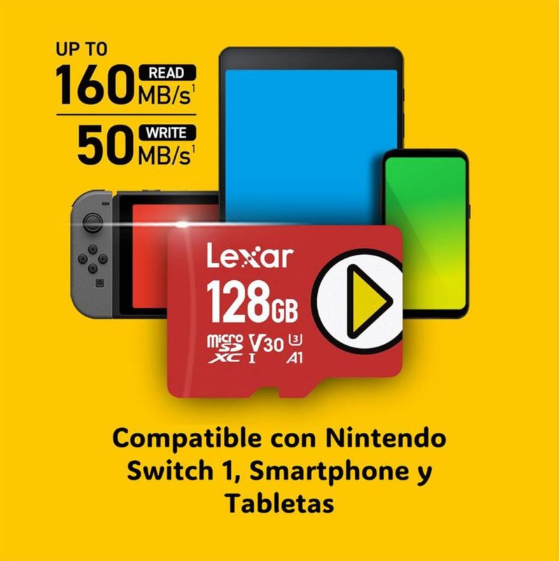 VideojuegosNintendo SwitchNintendo Switch AccesoriosLexar Tarjeta Micro SD Play de 128 GB, UHS-I, C10, U1, V10, A1, Full HD, 4K, hasta 160/50 MB/s para Nintendo-Switch 1, Juegos, Smartphones