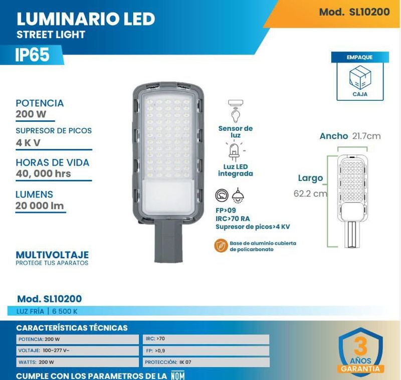 Luminario LED para Alumbrado Público 200W IP65 con Sensor de Luz Fría 6500K Multivoltaje 100–277V