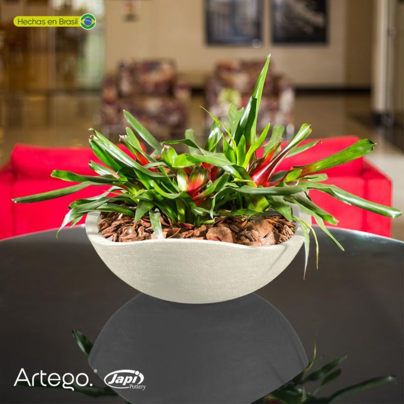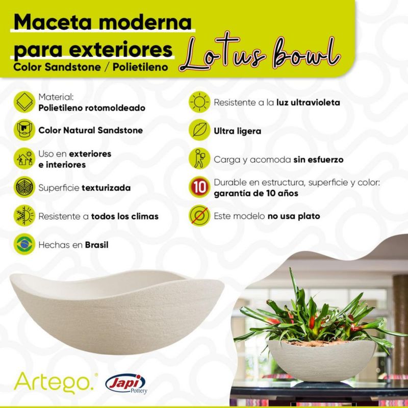 Maceta moderna compacta tipo bowl centro de mesa de 17 cm alto x 46cm de ancho LOTUS color arena sandstone de Polietileno ultra ligera Artego Japi