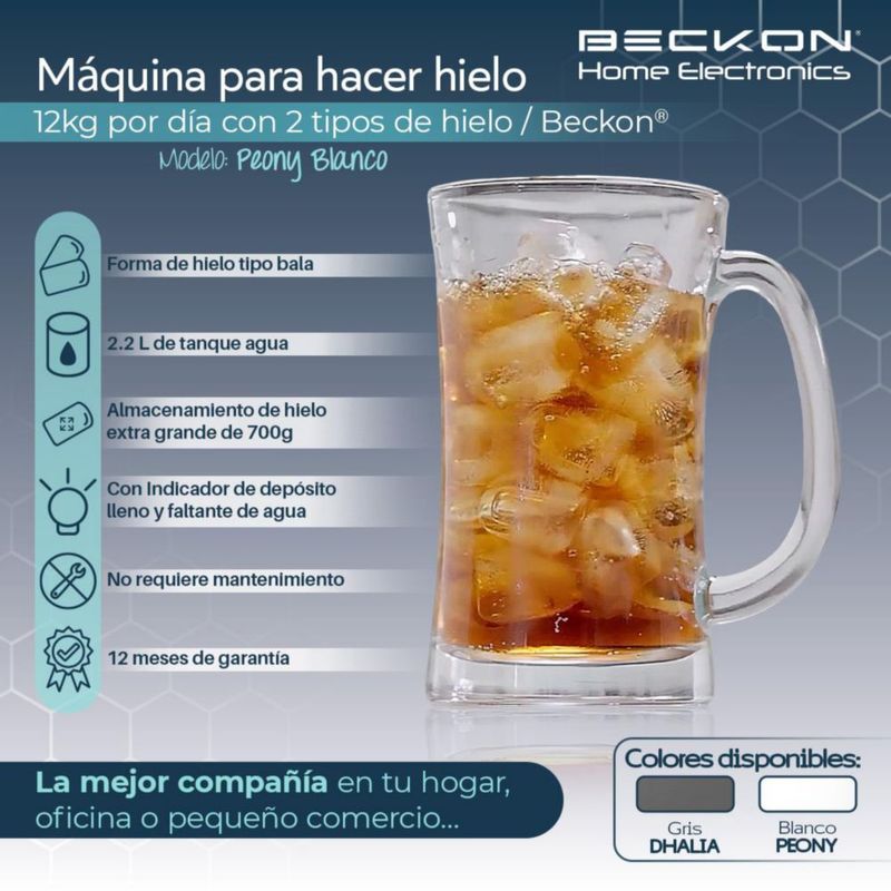 Máquina para hacer hielos PEONY Ice machine Beckon automática de 12kg por día hielo de 2 tamaños tipo bala con canasta y pala 127v