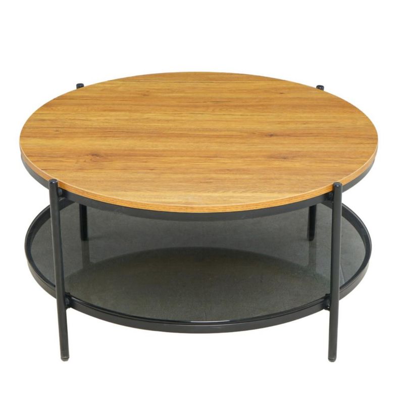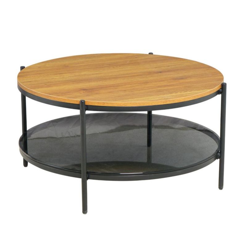Mesa de Centro Redonda de Madera MDF con Repisa de Cristal Ahumado y Base Metálica Negra