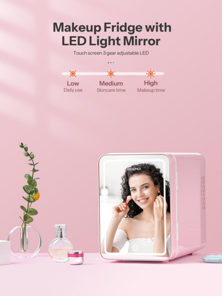 Mini refrigerador para cosméticos, maquillaje de 6 L con espejo con luz LED regulable para dormitorio, coche, oficina y dormitor