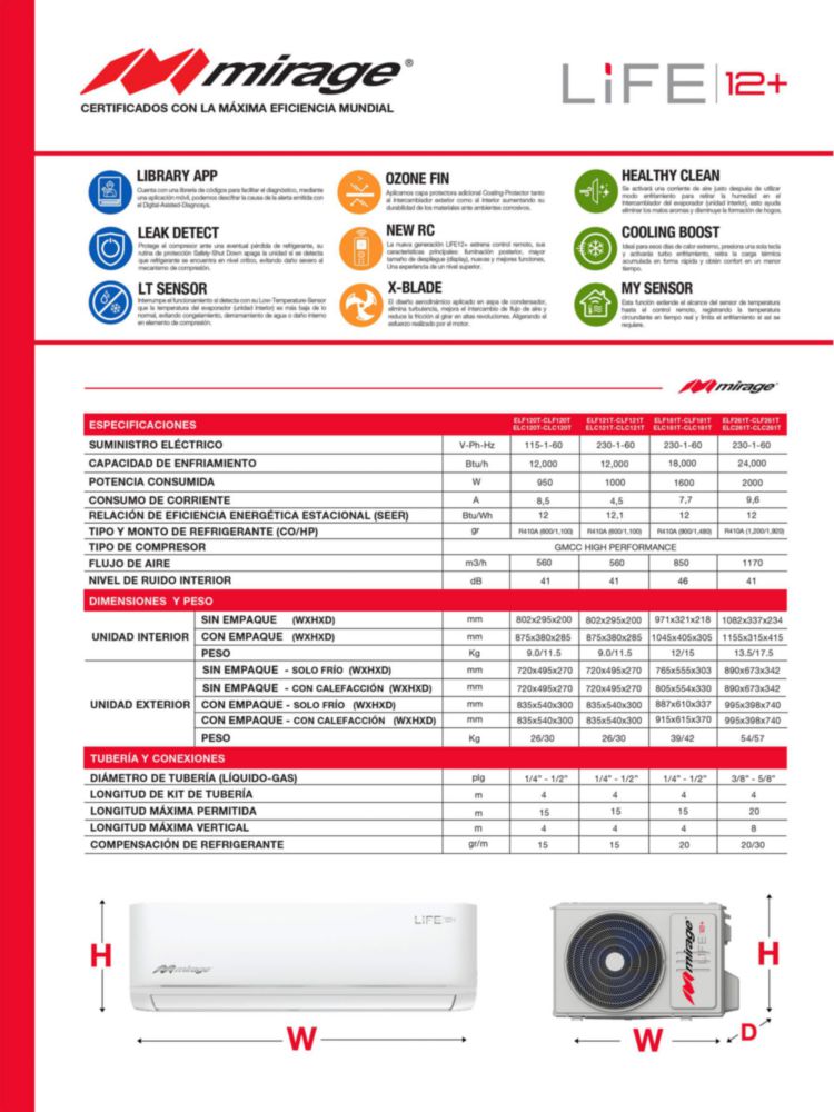Línea blancaClimatización y VentilaciónMiniSplitsMINISPLIT MIRAGE LIFE12 PLUS FRIO 1 TON