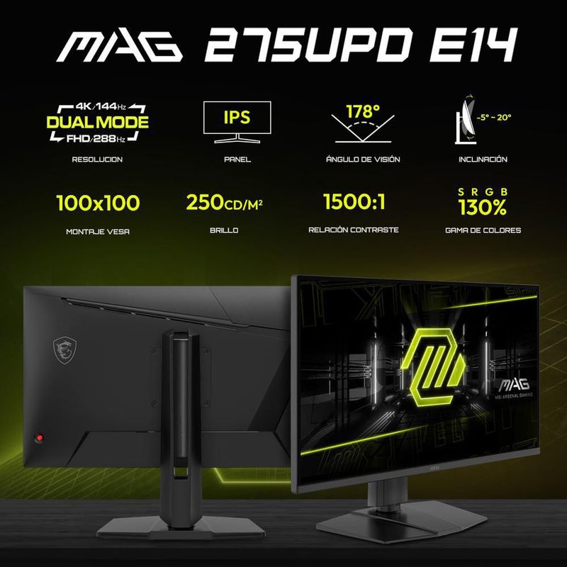 CómputoMonitores y ProyecciónMonitoresMonitor gamer 27 msi mag 275upd e14 1ms 288hz 4k uhd hdmi dp