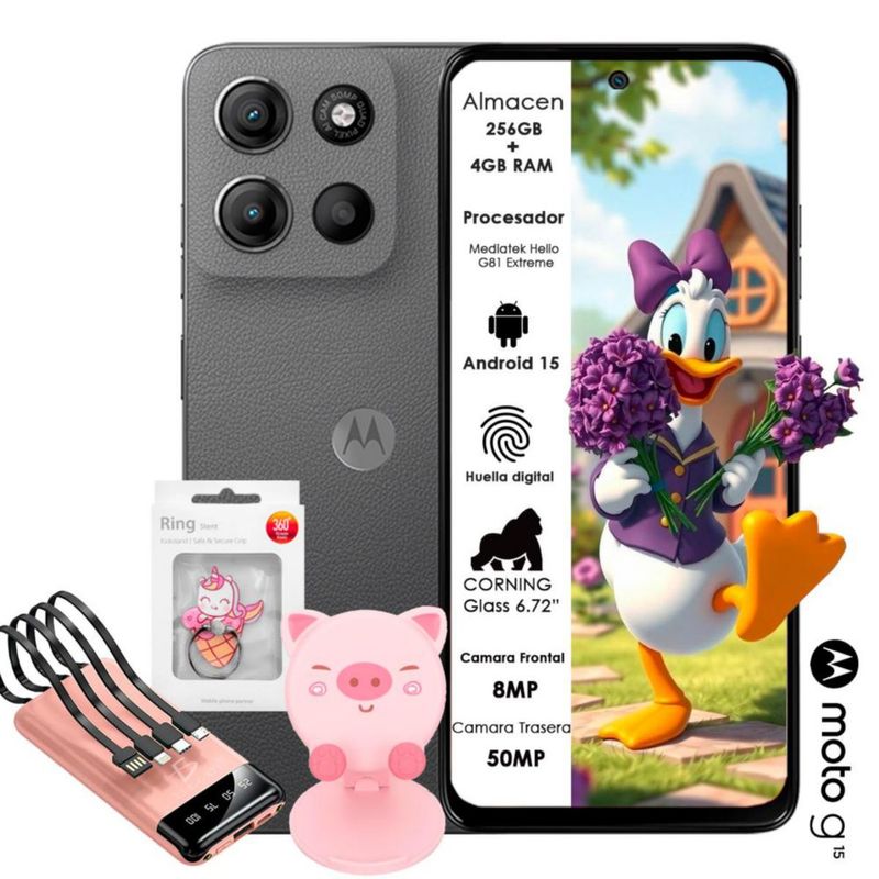 Motorola Moto G15 256GB 4GB RAM Gris +Porta llavero Celular + Porta Celular escritorio + Power Bank