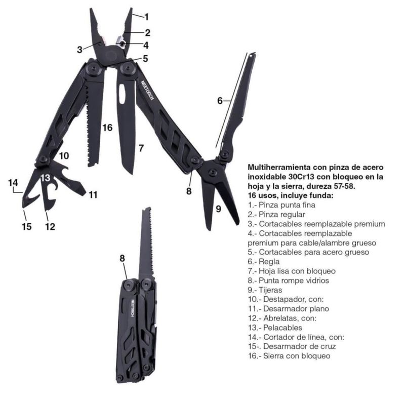 HerramientasManualesOtras Herramientas ManualesMultiherramienta BLACK Nextorch con pinza y tijera de 16 usos, con bloqueo, de acero inoxidable, dureza 57-58, negro