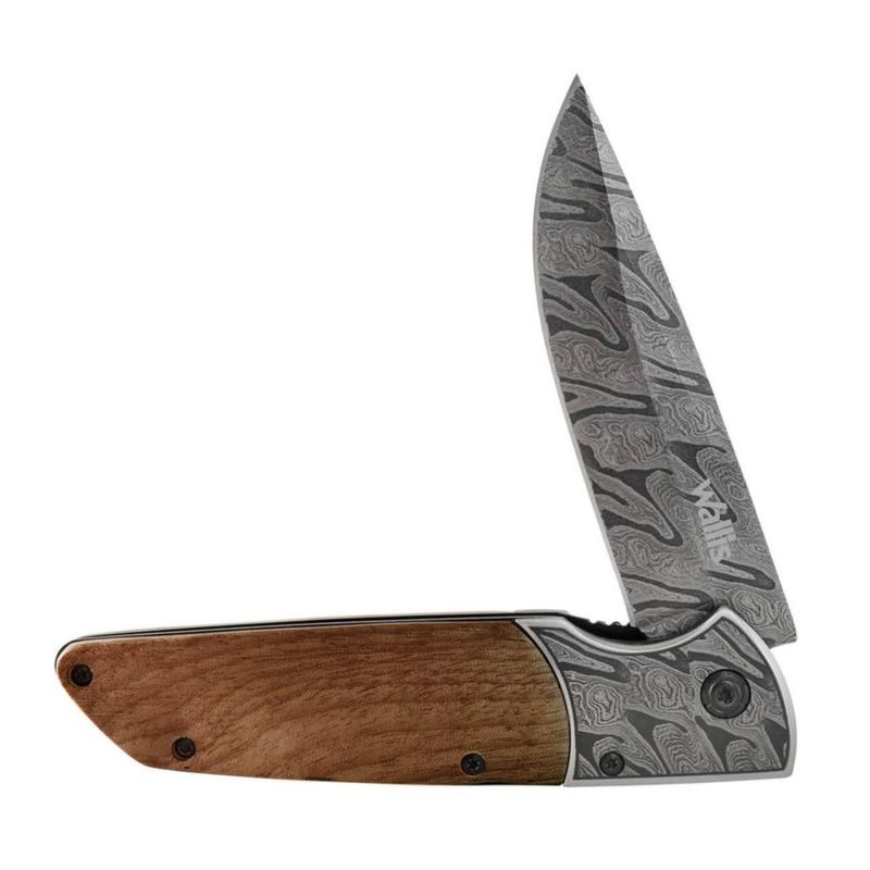 Navaja de bloqueo Wallis con mango de madera con acero, hoja lisa con diseño y clip