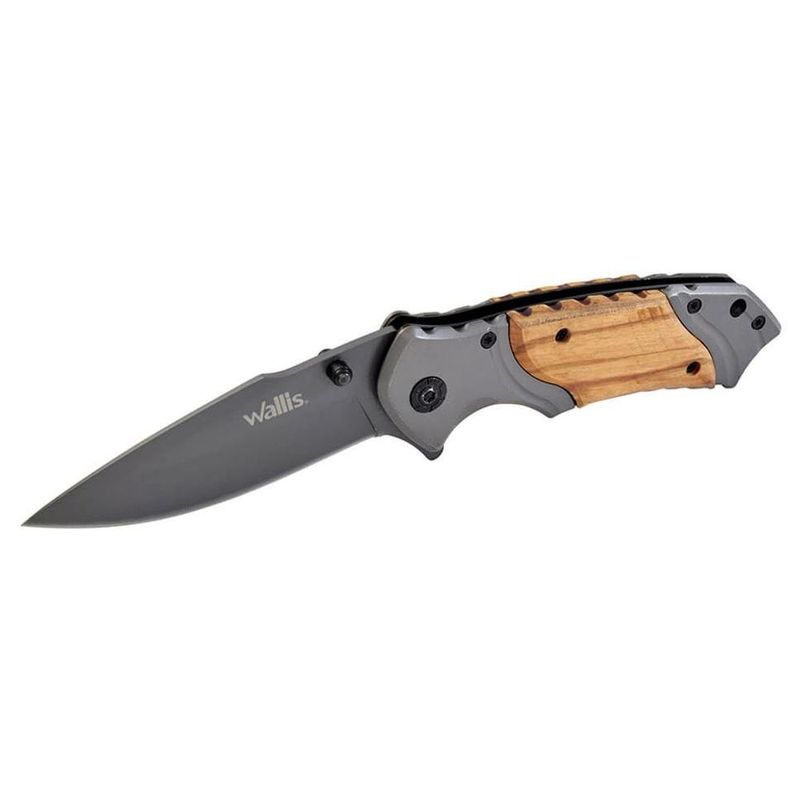 Navaja Wallis de bloqueo con mango gris y material tipo madera