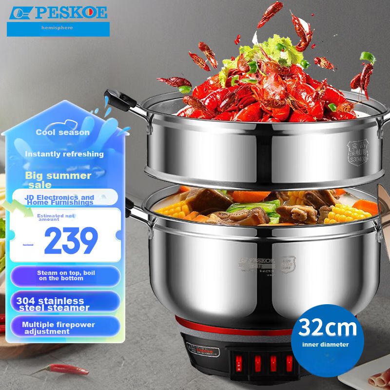 Olla Eléctrica Peskoe BQ-32C 32 cm Acero Inoxidable 304 Multifuncional con Vaporera