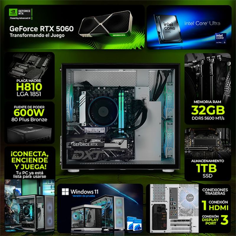 CómputoDe escritorioCPUPc gamer dxt rtx 5060 core ultra 5 32gb ddr5 ssd 1tb silver