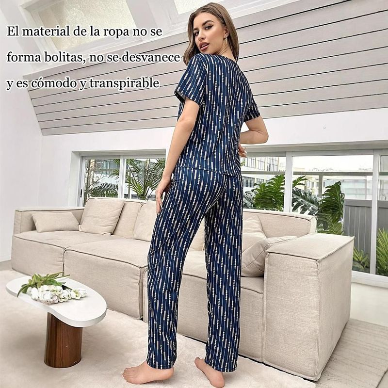 RopaRopa de DamaPijamasPijama para mujer de dos piezas camisa manga corta y pantalon largo con estampados verticales, tejido de poliéster azul HOGAWAY