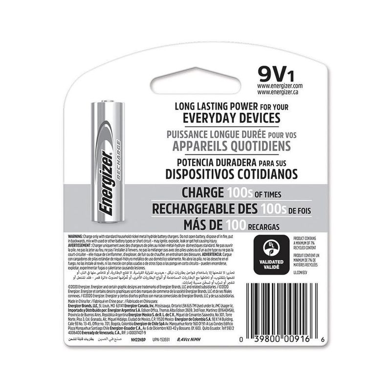 ElectrónicaAccesorios para electrónicaPilas y CargadoresPila energizer recargable 9v 175mah 8.4v nh22-175 cuadrara