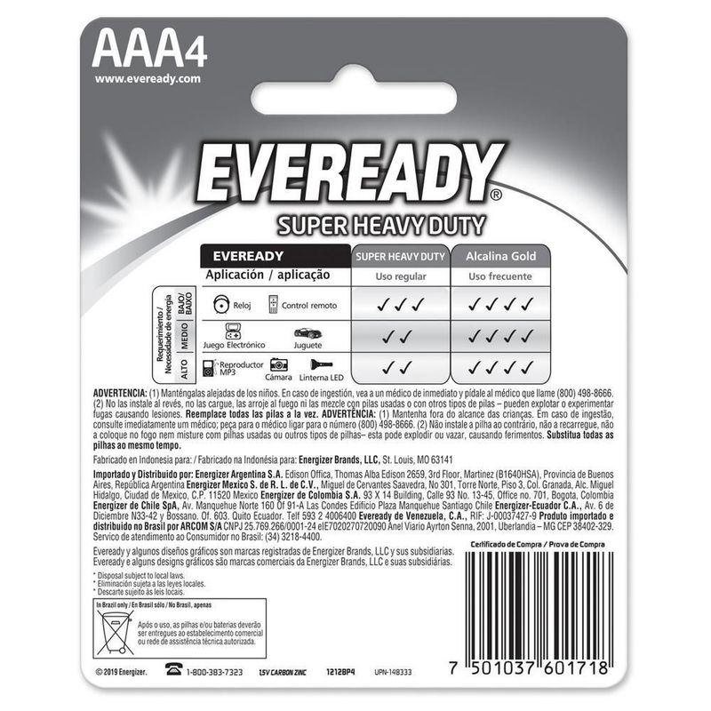 Pila eveready carbon zinc aaa blister 72 unidades 1.5v