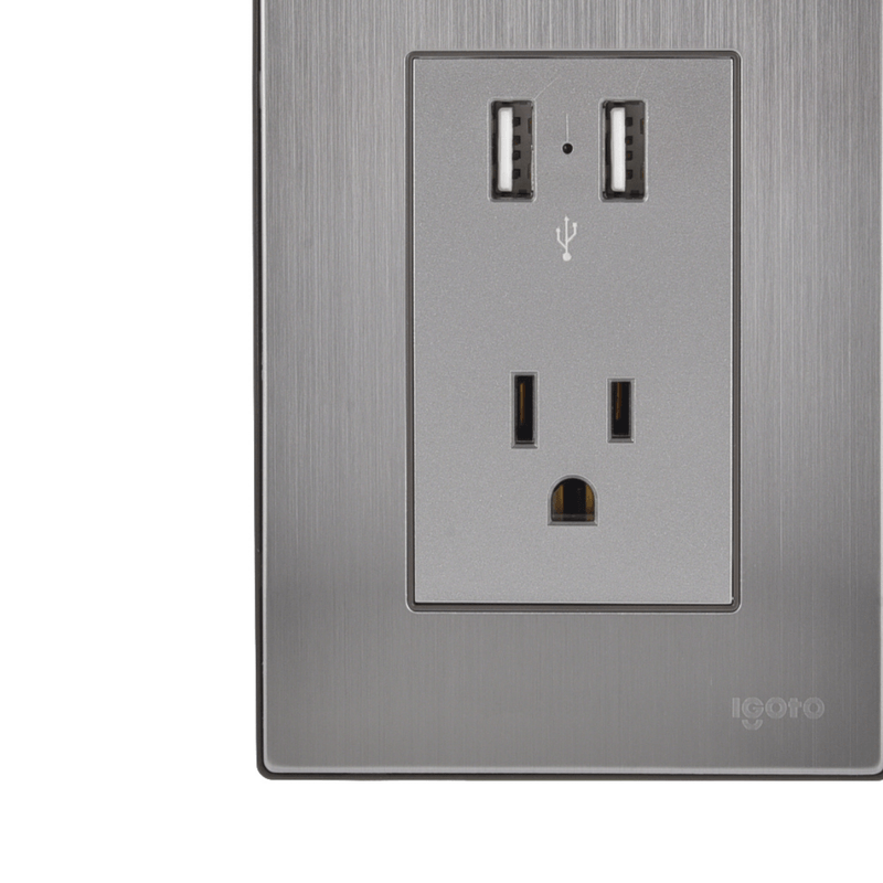 HerramientasIluminaciónIluminación InteriorPlaca armada Inox con 2 mecanismos de toma usb, de 2.1 Amp. Y 1 contacto de 1 módulo. plata IGOTO