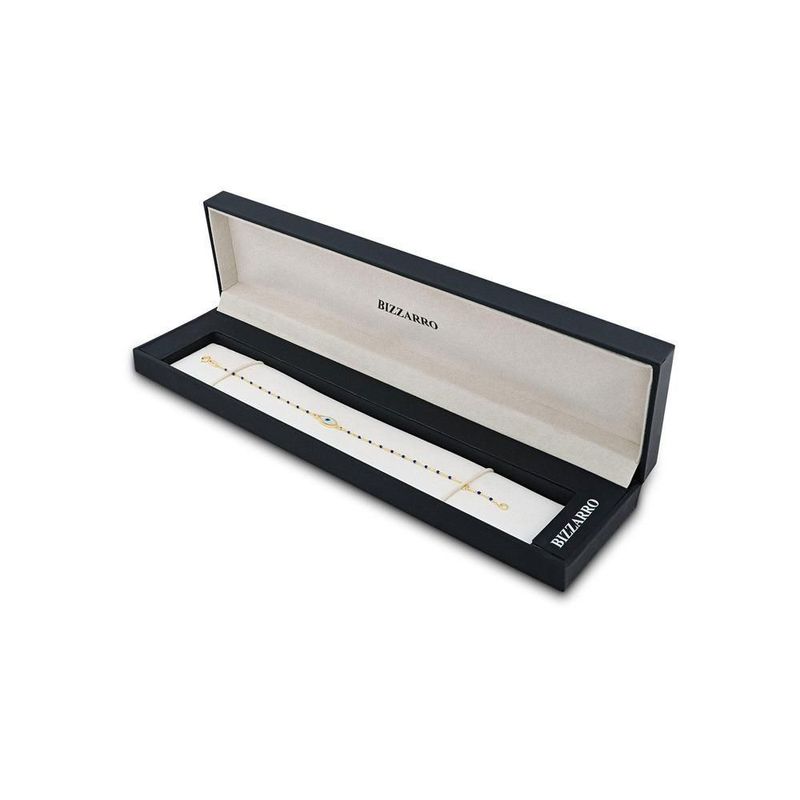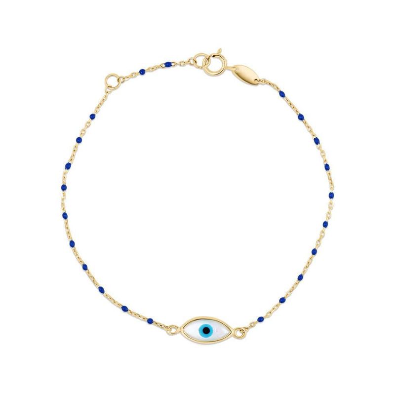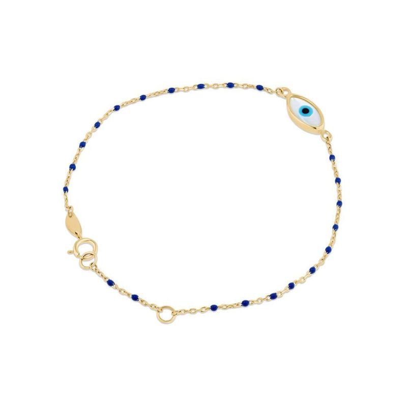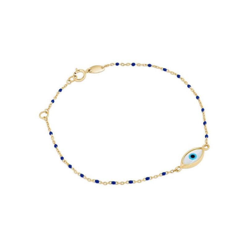 Moda y accesoriosJoyeríaPulserasPULSERA DE ORO AMARILLO 14K CON OJOR TURCO Y BOLITAS AZULES (18.5CM APROX.)