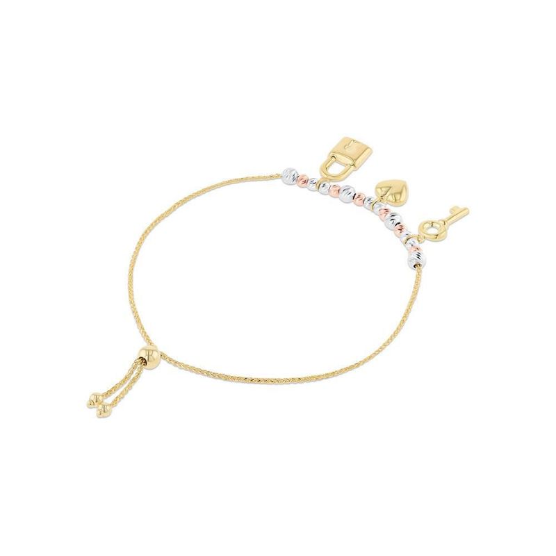 Moda y accesoriosJoyeríaPulserasPULSERA DE ORO FLORENTINO 14K CON LLAVE, CORAZÓN Y CANDADO (23 CM APROX)