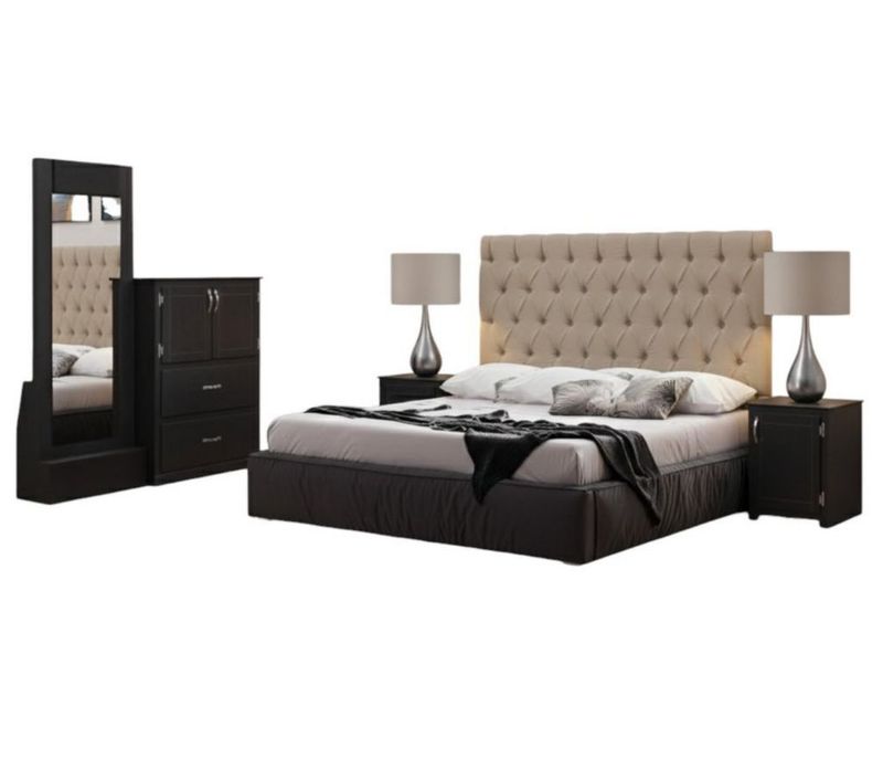 MueblesRecámaraRecámarasRecámara matrimonial capitonada beige chocolate 5 piezas