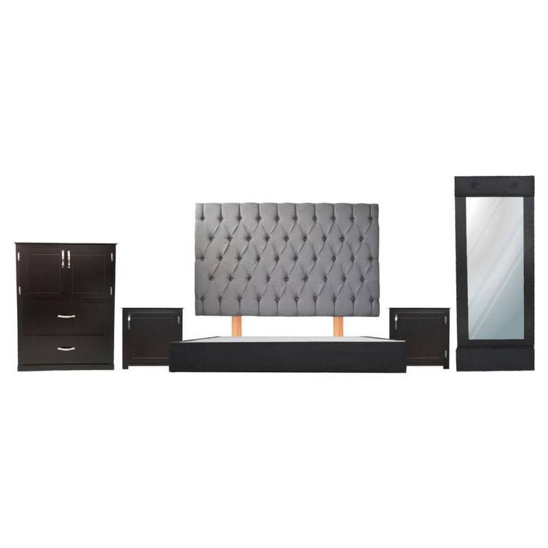 Recámara queen capitonada chocolate con gris claro 5 piezas