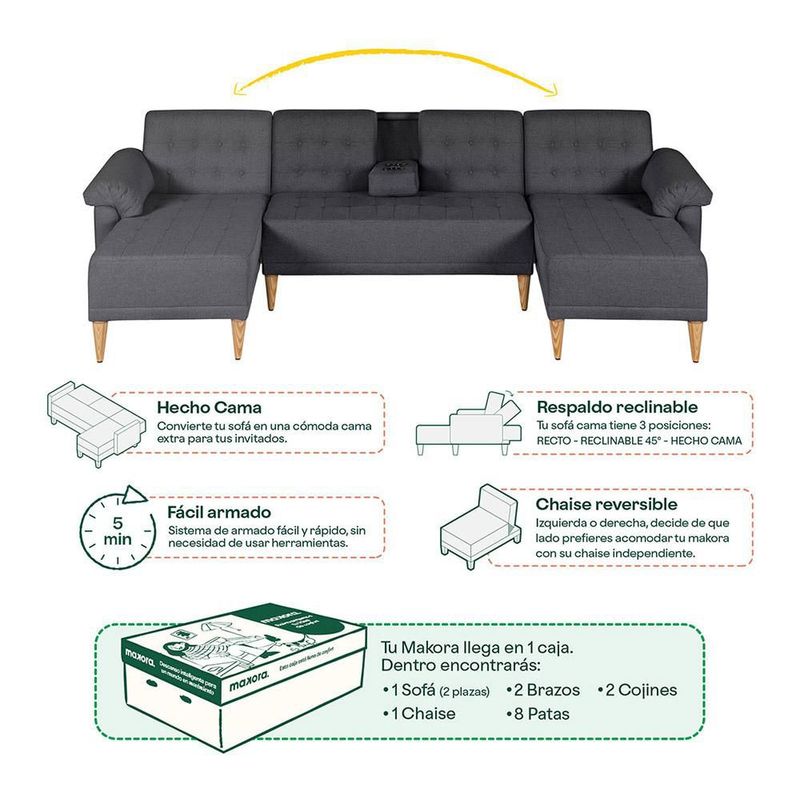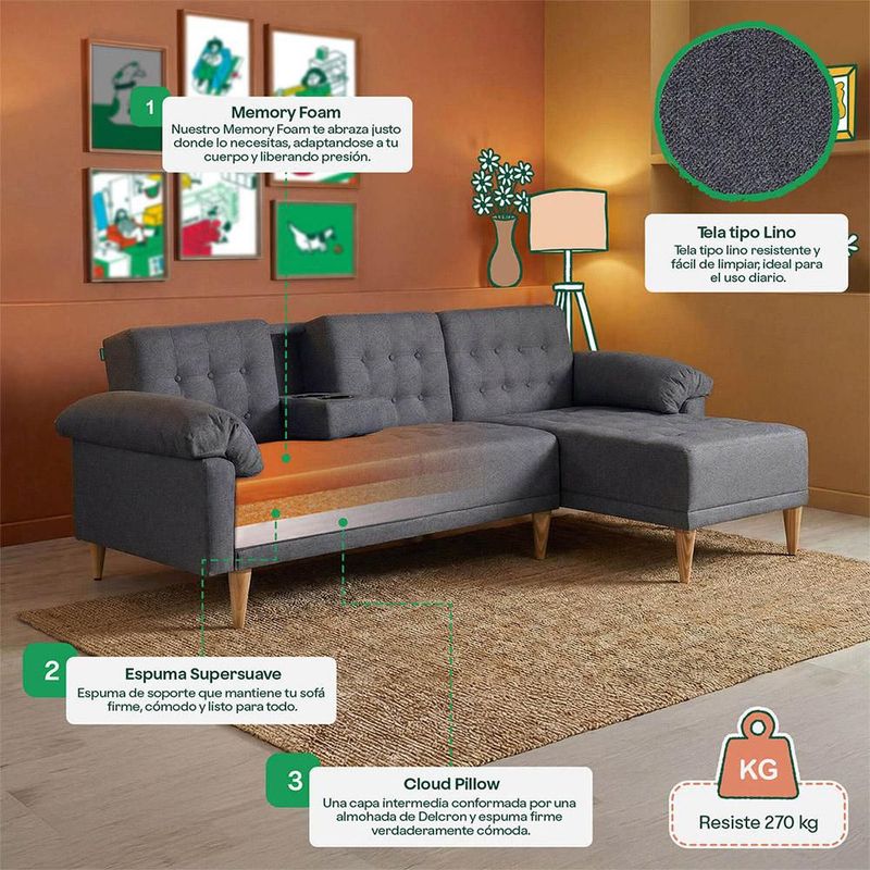 Sala Modular Reversible Brunello Color Gris Oxford Con Memory Foam Respaldo Reclinable 3 Posiciones