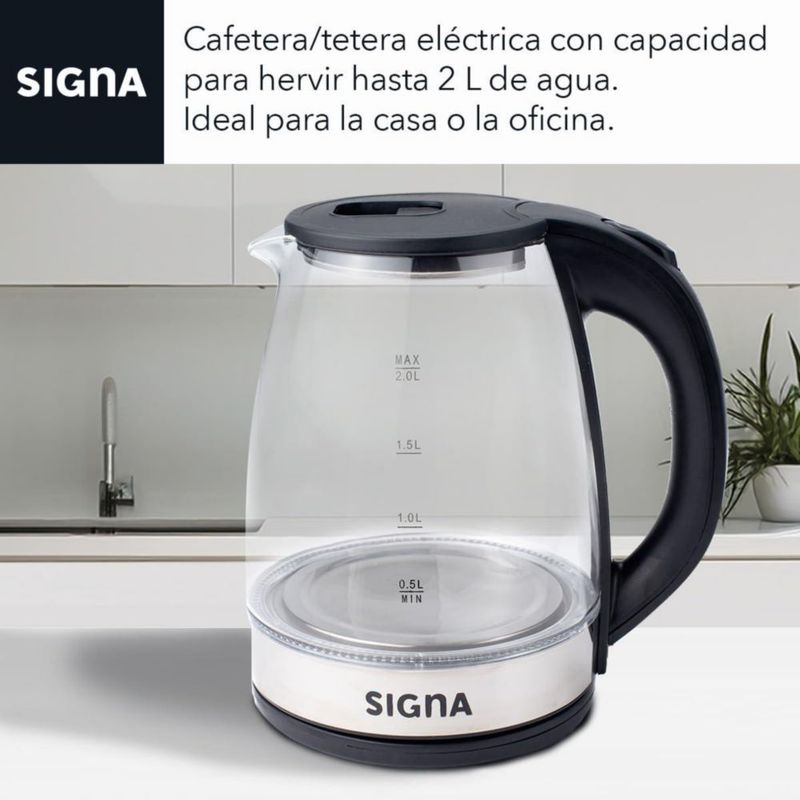 SIGNA Tetera Eléctrica Hervidor De vidrio Tetera De 2 Litros Con Luz LED Apagado Automático Resistente al Calor Asa Fría Base de
