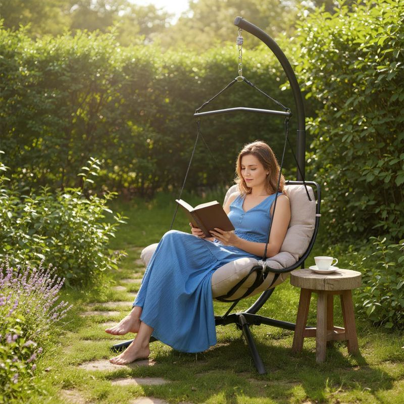 Silla Colgante con Base para Jardin,Interior y Exterior, Columpio para Patio o Terraza - Soporte Incluido con Cojin Comodo Leonore