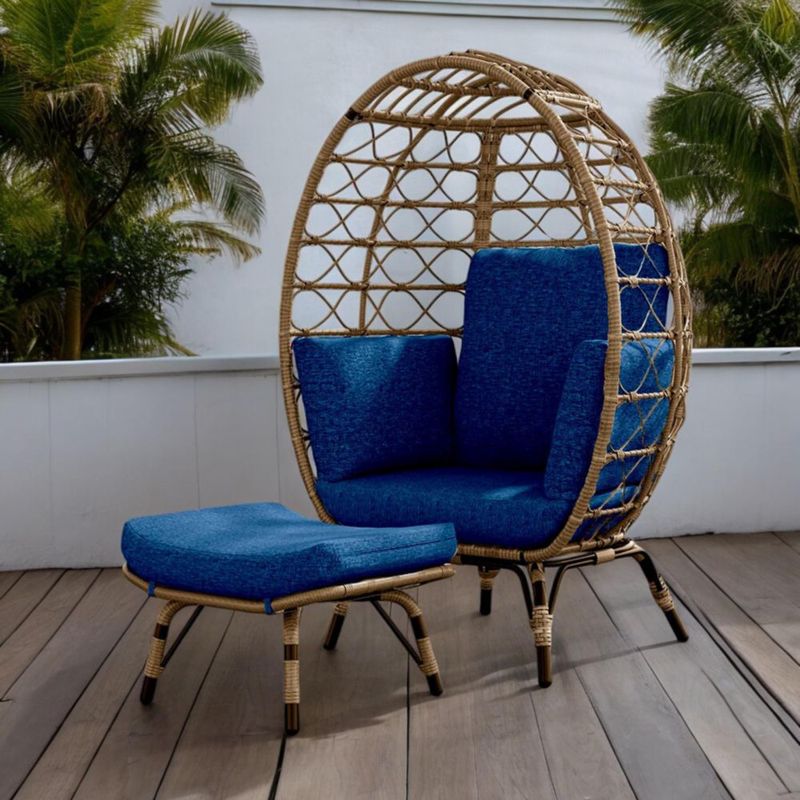 Ilios Innova | Silla tipo huevo azul con reposapiés. Resistente al agua, rayos UV. Ideal para relajarte y decorar tu espacio exterior.