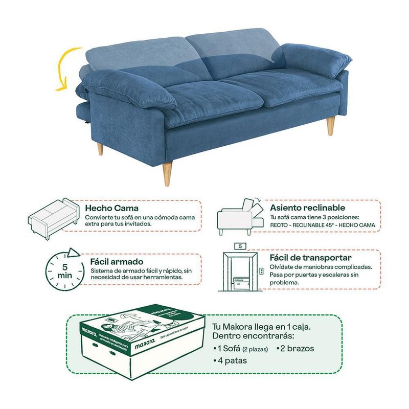 MueblesSalaSillones y SofásSofá Cama Makora Milo Con Memory Foam Color Azul Reclinable 3 Posiciones Recto Respaldo inclinado y Recostado Tela Velvet