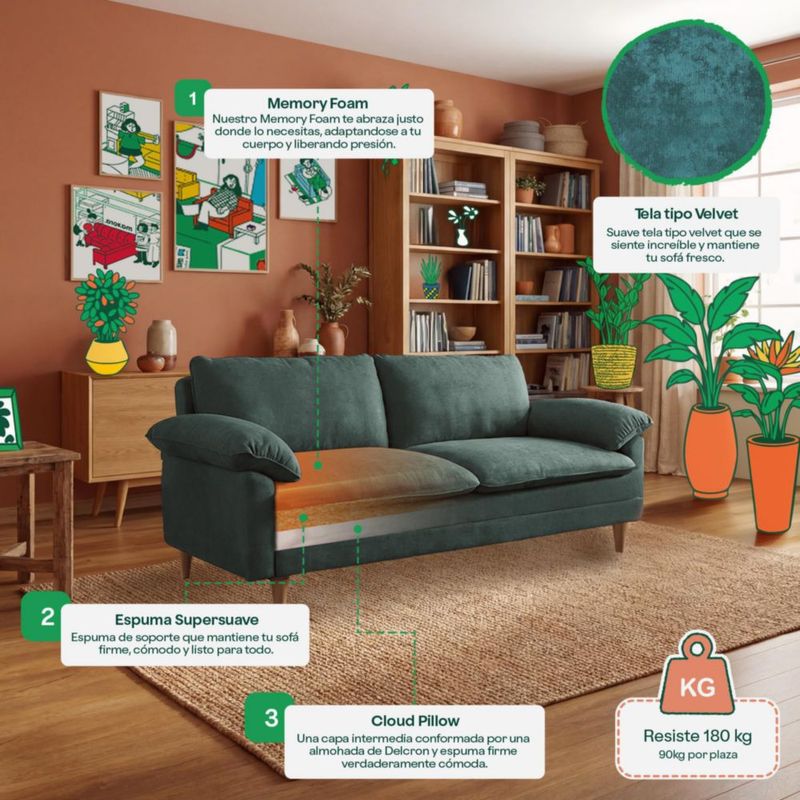 MueblesSalaSillones y SofásSofá Cama Makora Milo Con Memory Foam Olivo Reclinable 3 Posiciones Recto Respaldo inclinado y Recostado Tela Velvet