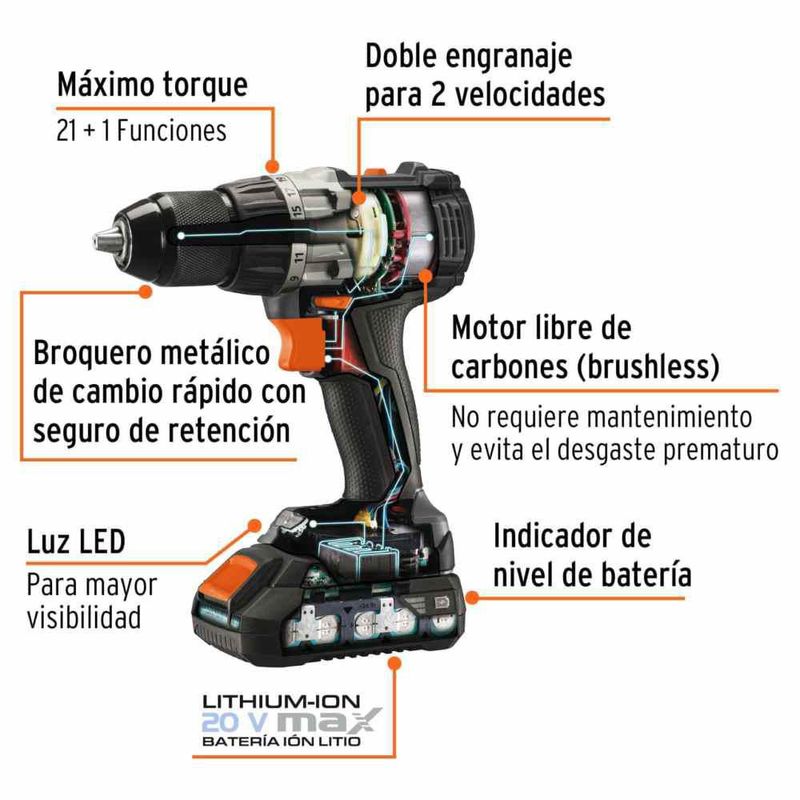 Taladro inalámbrico 1/2\, 20V, sin carbones, Truper MAX MAX-20T