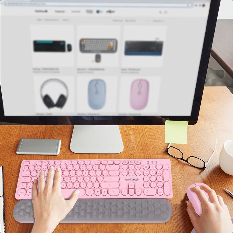 TechZone - Teclado y Mouse inalámbrico + Descansa Muñecas Pop Kit Pink