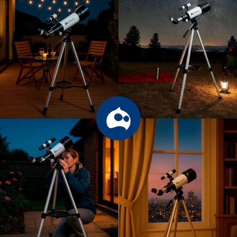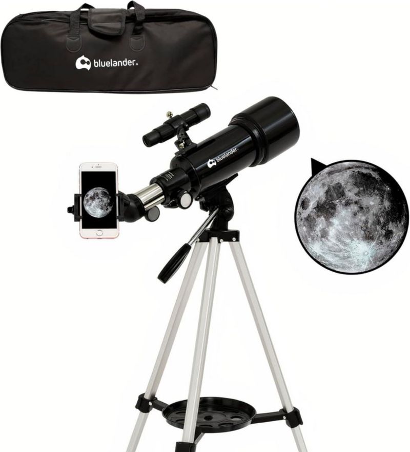 Telescopio Bluelander Astronómico 70 mm, Trípode 70–136 cm, Alta Definición, 2 Oculares, Lentes Barlow, Filtro Lunar, Soporte para Teléfono, (Negro).