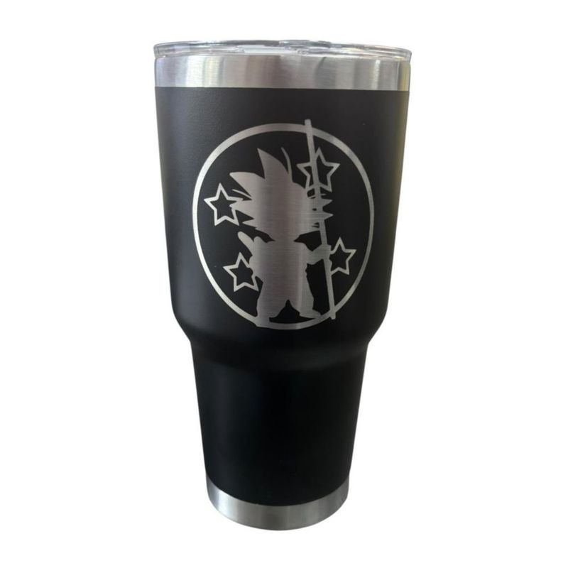 Termo de acero inoxidable color negro con diseño inspirado en Goku II. Su capacidad lo convierte en un accesorio práctico y resistente para tu día.