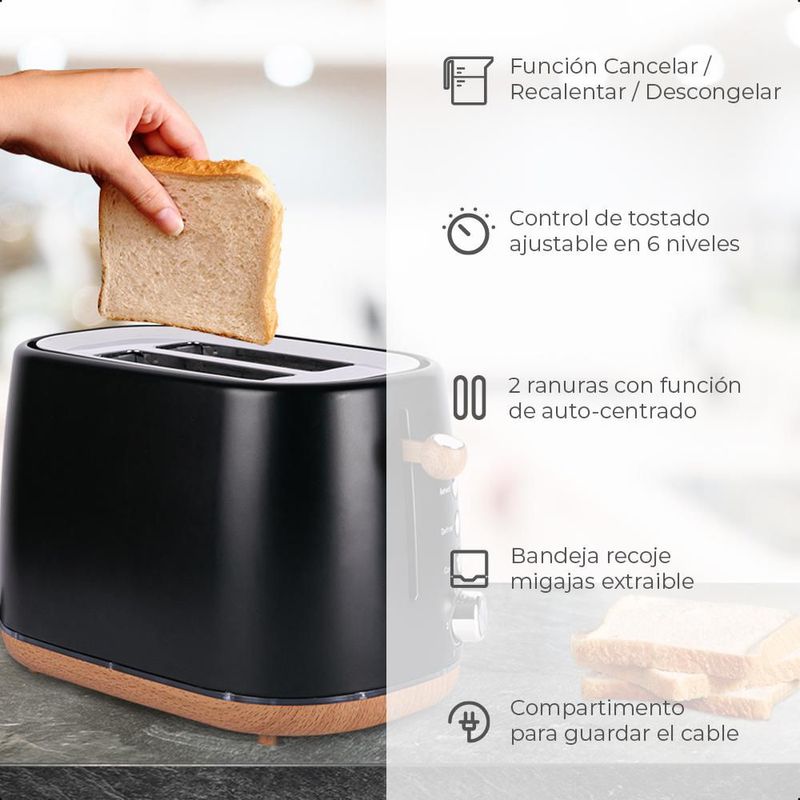 Línea blancaElectrodomésticosTostadores y ParrillasTostador DAEWOO 3 funciones con acabado de madera 2 ranuras