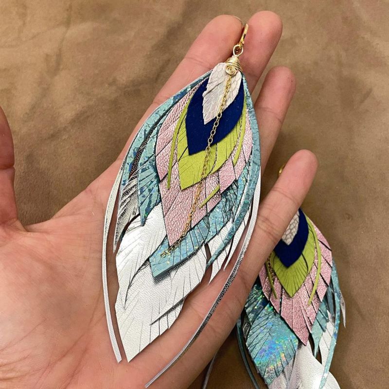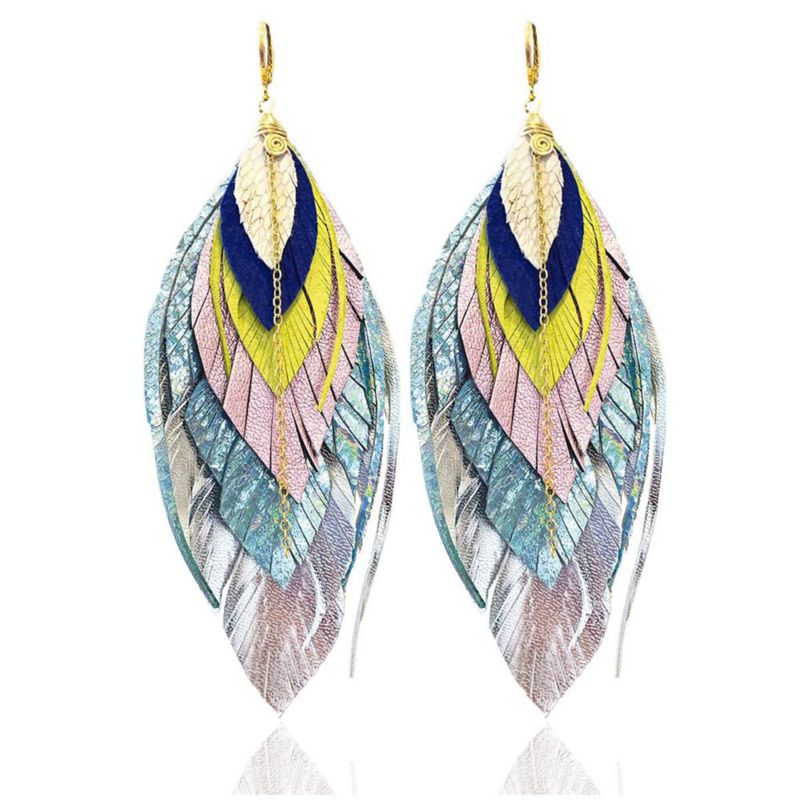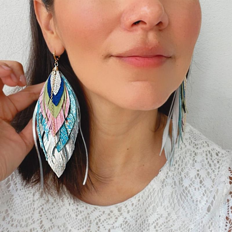 Moda y accesoriosJoyeríaAretesVangania Aretes largos 12cm piel arcoíris metalizada azul rosa baño oro