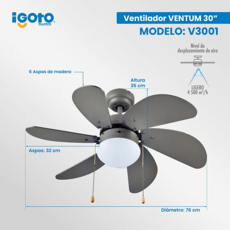 Ventilador 30'' 60W 1 Luz Cadena / cuerpo gris titanio aspas gris / VENTUM