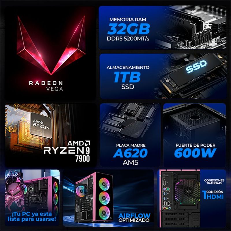 CómputoDe escritorioCPUXtreme pc gaming radeon 720m ryzen 9 32gb ddr5 ssd 1tb pink