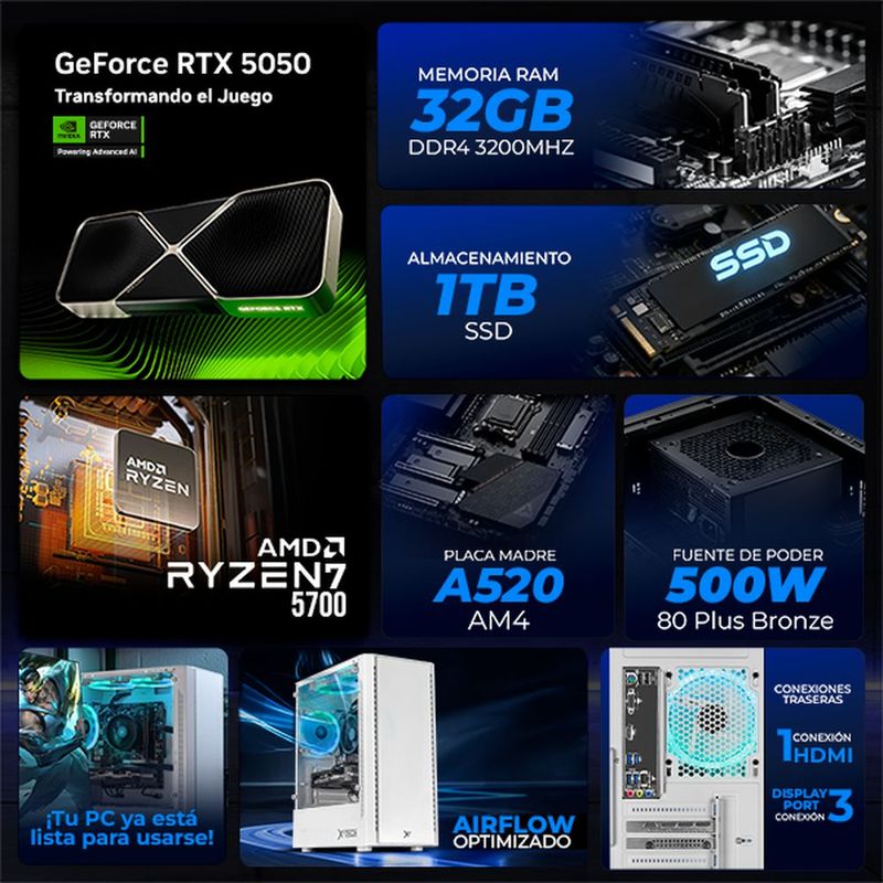 CómputoDe escritorioCPUXtreme pc gaming rtx 5050 ryzen 7 32gb ssd 1tb wifi white