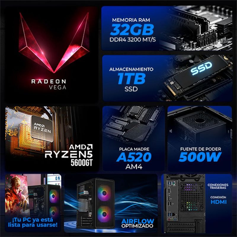 CómputoDe escritorioDesktopXtreme pc radeon vega 7 ryzen 5 32gb 1tb monitor 23.8 black